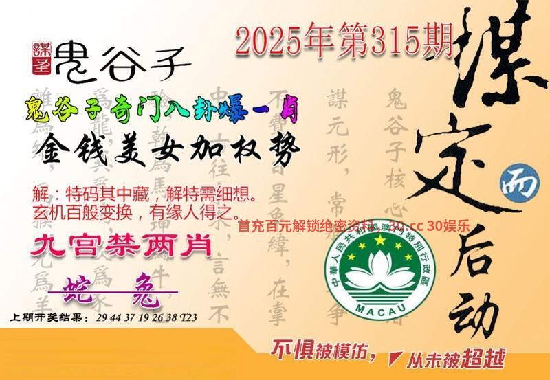 | 315期鬼谷子《金钱美女加权势》 解释:这句话反映了一种社会现象和价值观,即在某些人眼中,金钱、美女和权势是衡量成功和幸福的重要标准 综合:狗龙虎羊牛猪马兔 |